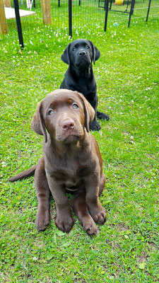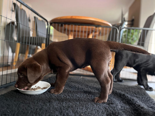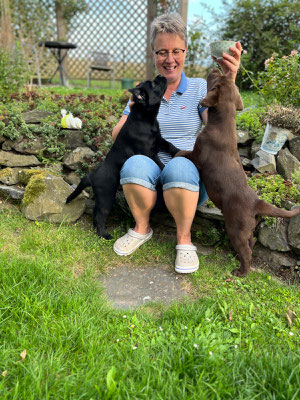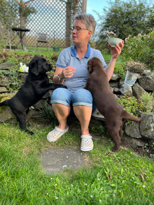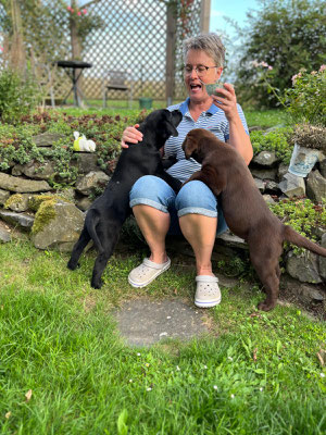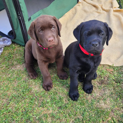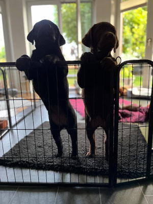Unser Traum hat sich erfüllt! Am 21.05.2025 erblickte unser A-Wurf das Licht der Welt. Um 14:00 Uhr begann die Geburt, und um 18:30 Uhr war das erste schwarze Mädchen da. Die zweite ließ sich Zeit und erschien erst um 23:00 Uhr – ein braunes Mädchen. Caja meisterte ihre Mutterrolle perfekt und beide durften gleich an der Milchbar naschen. Die erste Nacht war turbulent mit zwei quengelnden Mädchen und viel Arbeit für Caja. Doch allen geht es gut, und wir freuen uns auf eine aufregende, anstrengende Welpenzeit!