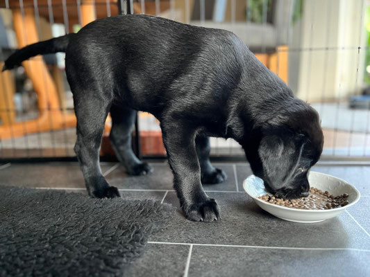 Heute gab’s Premiere: Trockenfutter! Jeder von uns bekam eine Mini-Schüssel mit 50 Gramm. Mama durfte draußen bleiben – kein Zugang!