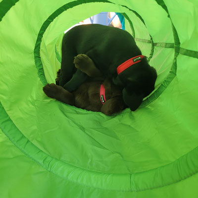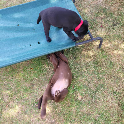 Bei uns ist es mit nur einem Welpen deutlich entspannter. Antje tobt den ganzen Tag mit Mama Caja, die geduldig alles mitmacht – bis auf einen Punkt: Sobald Antje an die Milchbar will, gibt’s ein knurriges "Feierabend!".