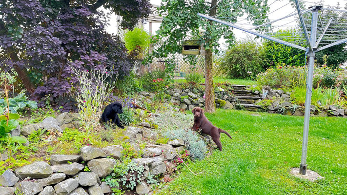 Bei Windstille dürfen wir in den Garten. Gras? Igitt. Rosenblätter? Bah. Laub? Nicht essbar, aber perfekt zum Hinterherjagen!