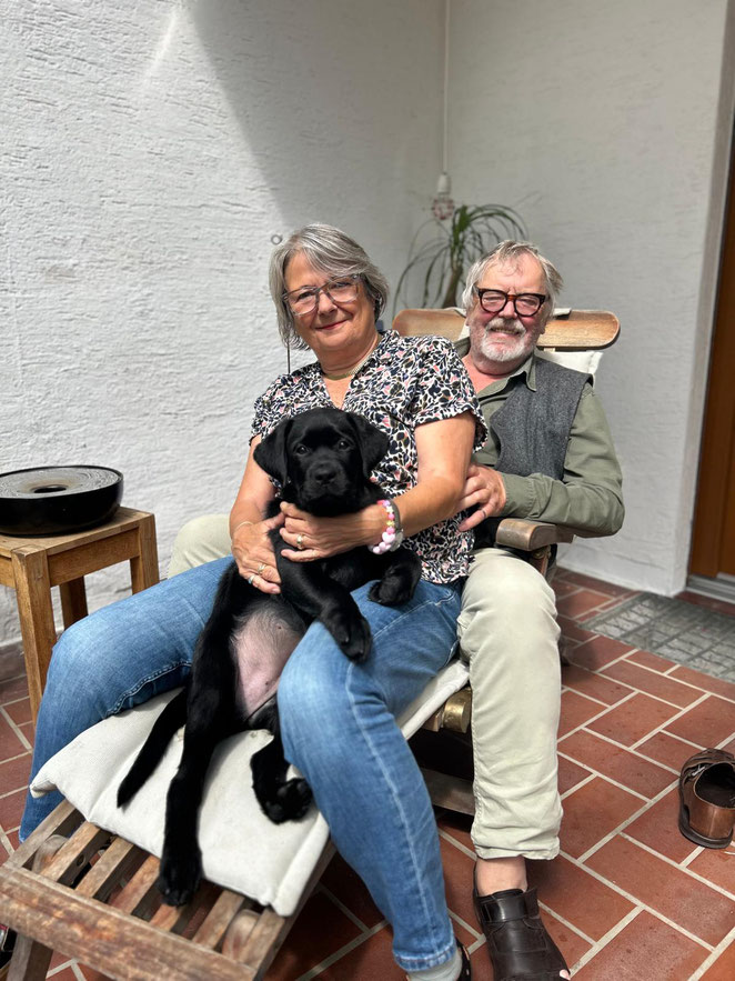 Hier sieht man Ella mit ihren neuen Lieblingsmenschen in ihrem schönen neuen Zuhause!